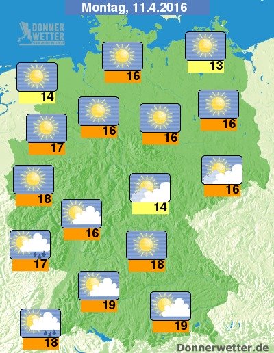 Heute ist es im Land zunächst verbreitet heiter oder sonnig und dazu trocken, gegen Abend ziehen im Südwesten jedoch teils dichte Quellwolken auf, dabei sind Schauer und Gewitter möglich, im übrigen Bundesgebiet ziehen hingegen nur einige Wolken durch und es bleibt trocken. Die Temperatur steigt auf 13 Grad in Rostock und bis 19 Grad in München.