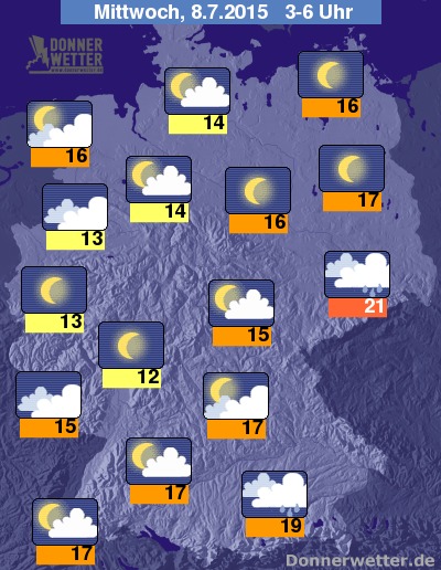 In der Nacht zum Mittwoch verlagern sich die Schauer und weiterhin teils schweren Gewitter immer weiter in den Osten und Süden Deutschlands, gegen Morgen sind nur noch im Südosten und im äußeren Süden zeitweise Schauer und einzelne Gewitter möglich. In den übrigen Landesteilen zeigt sich der Himmel im Nachtverlauf zunehmend locker bewölkt und häufig auch sternenklar, dazu bleibt es dann trocken. Die Temperatur sinkt auf tropische 21 Grad in Dresden und bis 12 Grad in der Wetterau.