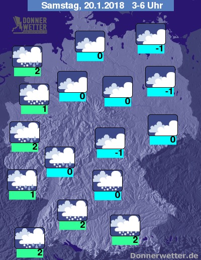 In der folgenden Nacht zieht sich der Himmel im gesamten Land zu und über der Südwesthälfte fällt immer wieder Schnee, zum Teil auch Schneeregen oder Regen, dabei besteht häufig Glättegefahr! Im Norden und Osten sind nur hier und da ein paar Flocken möglich, meist bleibt es trocken. Die Temperatur sinkt auf 2 bis -1 Grad.