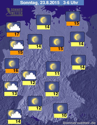 Die Temperaturen in der Nacht sinken von 10 Grad C in Oberbayern bis zu 17 Grad C im Ostfriesland.