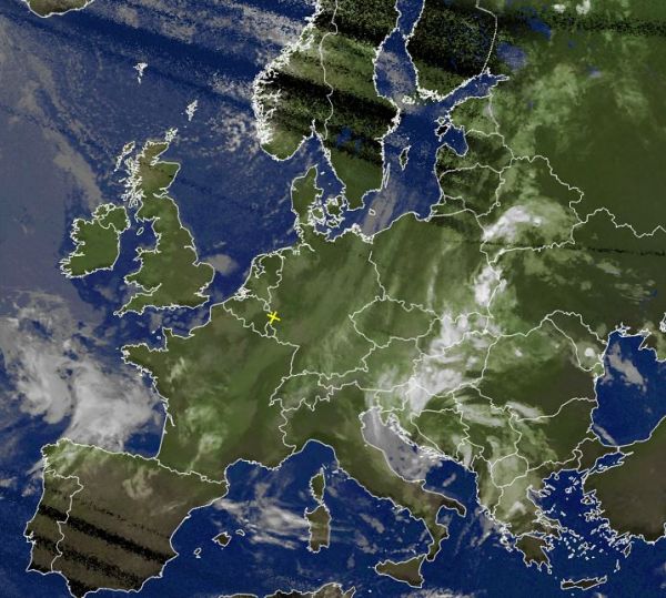 Auf dem Satellitenfoto von heute Morgen zeigen sich große Teile von Europa unter Hochdruckeinfluss nur locker bewölkt oder auch wolkenlos. Dagegen bringt ein Tief über dem Balkan dort und in weiten Teilen Südosteuropas dichte Wolkenmassen und es bilden sich gebietsweise kräftige, gewittrige und auch ergiebige Regengüsse.