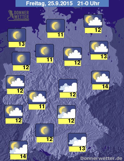 In der Nacht zum Samstag bleibt es über der Nordhälfte Deutschlands verbreitet sternenklar, stellenweise kann sich hier jedoch Nebel oder Hochnebel bilden. Weiter nach Süden hin ist es zumeist locker bewölkt, vor allem im Süden und Südosten aber auch noch oft stark bewölkt, dazu bleibt es jedoch trocken. Die Temperatur sinkt auf 11 Grad im Breisgau und bis 8 Grad in der Lüneburger Heide.