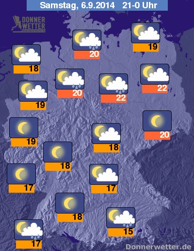Am Abend lassen die Schauer und Gewitter von Westen her meist nach, in einem breiten Streifen vom Bayerischen Wald, über Thüringen, Sachsen-Anhalt bis nach Schleswig-Holstein bilden sich gebietsweise aber weitere Schauer und Gewitter, sonst bleibt es bei meist lockerer Bewölkung weitgehend trocken. Die Temperatur liegt bei schwülwarmen 22 Grad in Magdeburg und etwa 15 Grad im Allgäu.