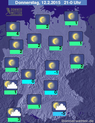 In der Nacht zum Freitag bleibt es in der Osthälfte der Republik überwiegend sternenklar, sonst ziehen von Westen her jedoch zeitweise einige Wolken durch und gebietsweise ist es auch stark bewölkt. Dabei bleibt es aber überall trocken. Die Temperatur sinkt auf 2 Grad in Köln und bis -5 Grad in München.