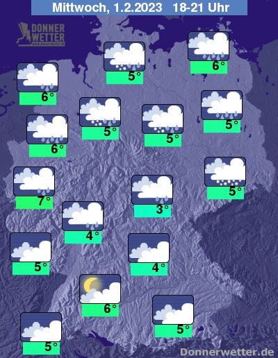 Am Donnerstag zeigen sich im Norden und Osten oft heitere Abschnitte, teils ziehen hier jedoch auch dichte Wolken durch, die vereinzelt Schauer mitbringen. Im übrigen Bundesgebiet ist es meist stark bewölkt und es fällt gebietsweise Regen, Schneeregen oder Schnee. Die Temperatur steigt auf 3 Grad in Erfurt und bis 7 Grad in Meppen. An der See weht ein oft stürmischer Wind.