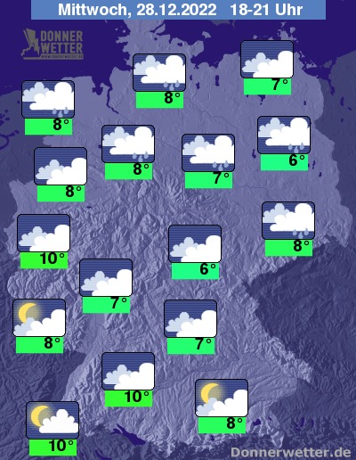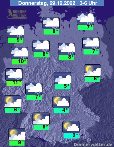 In der Nacht zum Donnerstag ist der Himmel über dem Süden oft locker bis aufgelockert bewölkt, hier bleibt es weitgehend trocken. Im übrigen Land zieht verbreitet dichte Bewölkung durch und es fällt vielerorts Regen. Die Temperatur sinkt auf 11 Grad in Köln und 2 Grad im Raum München. Mit Ausnahme des Südens weht ein oft starker und teils stürmischer Wind. An der Nordsee herrscht häufig Sturm.