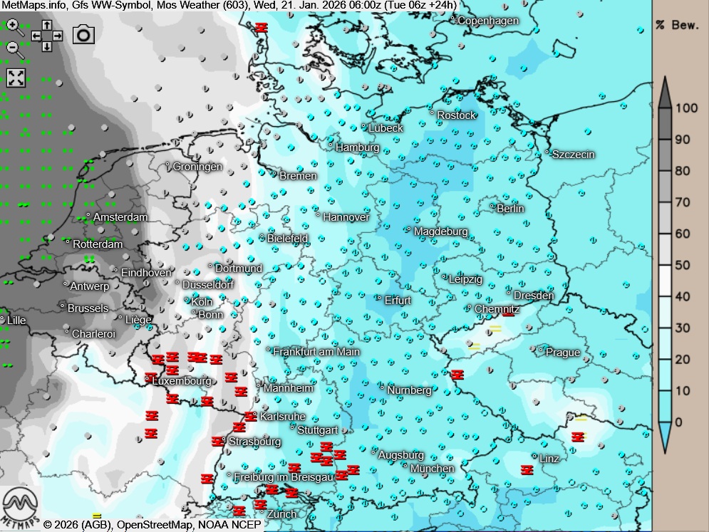 Die Temperatur- / Wetterkarte für Mittwochfrüh (06:00 Uhr) nach GFS: