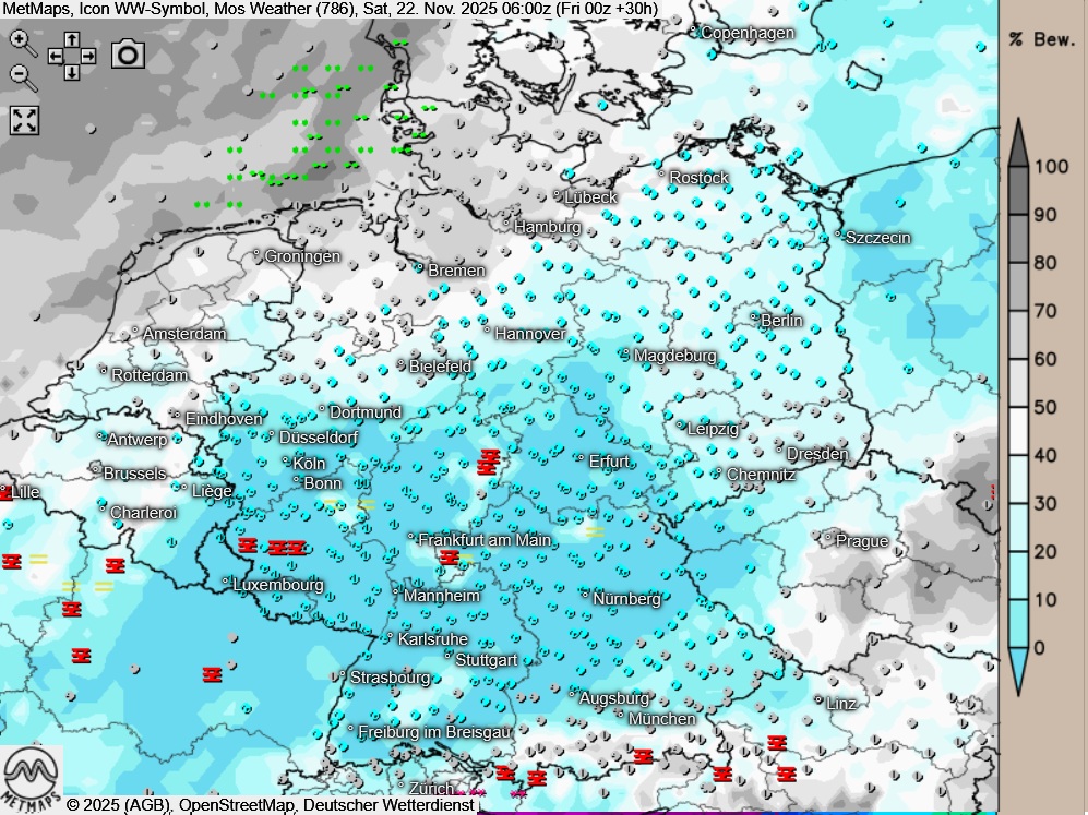 Die Temperatur- und Wetterkarte für Samstagfrüh (06:00 Uhr) nach Icon: