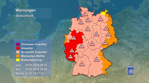 In den kommenden Stunden zieht von Westen her ein Tiefausläufer mit deutlich milderen Luftmassen über Deutschland hinweg, dabei ist mit Ausnahme eines schmalen Streifens im äußeren Westen des Landes erhöhte Vorsicht auf den Straßen geboten, denn der von Westen eintreffende Regen fällt verbreitet noch auf den gefrorenden Boden, so dass sich Blitzeis ausbilden kann!!! Gegen Mitternacht erreicht die Regenfront etwa eine Linie von Hamburg bis ins Allgäu. Nach Mitternacht und bis zum Morgen zieht der Tiefausläufer auch über die weiter östlich liegenden Landesteile. Dabei ist neben Schnee, Schneeregen und Regen, ebenfalls überfrierender Regen möglich!!! Hier die aktuelle Warnkarte: