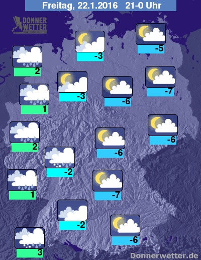 Heute Abend bleibt es über der Osthälfte Deutschlands noch oft locker bewölkt oder vor allem anfangs auch sternenklar und dazu trocken. In die westlichen Landesteilen ziehen aus Westen her dagegen dichte Wolken mit Regen oder Schneeregen und anfangs auch mit überfrierendem Regen auf, dabei besteht verbreitet die Gefahr vor Blitzeis!!! Gegen Mitternacht umfasst das Niederschlagsgebiet in etwa die Westhälfte der Republik. Die Abendtemperatur liegt bei 3 Grad im Breisgau und bei noch sehr frostigen -7 Grad in Franken.