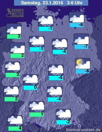 Am Samstag zunächst vor allem in den östlichen Landesteilen oft Regen, Schneeregen, Schnee und überfrierender Regen, sonst meist dichte Wolken und zeitweise Regen, in den westlichsten Landesteilen meist trocken und teils Auflockerungen, 2 bis 6 Grad.