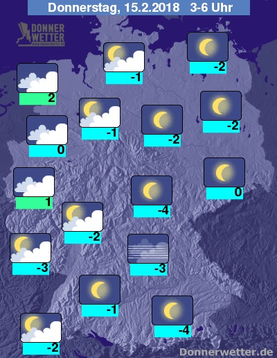 In der bevorstehenden Nacht bleibt es vor allem über der Osthälfte Deutschlands verbreitet sternenklar. Weiter nach Westen ist es anfangs auch noch oft leicht oder aufgelockert bewölkt, in den westlichsten Landesteilen ziehen jedoch bis zum Morgen zunehmend dichte Wolken auf, die gegen Morgen auch ersten Schnee oder Regen bringen können, sonst bleibt es trocken. Die Temperatur sinkt auf 2 Grad an der Nordsee und bis -4 Grad im Chiemgau.