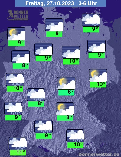 Am Freitag ziehen überwiegend dichte Wolken von Südwest nach Nordost über Deutschland hinweg und es fällt immer wieder Regen. Die Temperatur steigt auf 9 Grad in Erfurt und etwa 14 Grad in München.