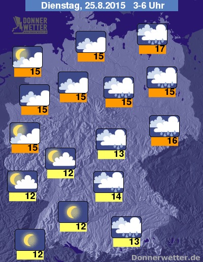 Die Nacht in den Dienstag zeigt sich im Westen und im Nordwesten ruhig. Im Nordosten und in Bayern wird die Nacht, nach Prognosen sehr regnerisch. Im Land Baden-Württemberg schaut es nach einer Nacht mit soweit klarem Himmel aus.