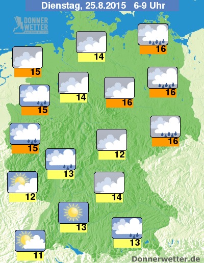Die Temperaturen steigen am Morgen von 11 Grad C im Schwarzwald bis auf 16 Grad C in Sachsen.
