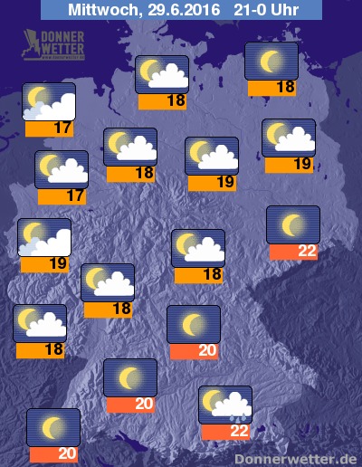 Der Mittwochabend beschert weiten Teilen der Republik trockenes Juniwetter, Sonne und Wolken wechseln sich ab, vor allem entlang der Oder und auf der Schwäbischen Alb sind auch noch längere sonnige Abschnitte möglich. Einzelne Gewitter entladen sich meist nur im Alpenvorland.