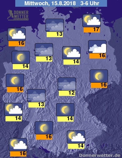 In der kommenden Nacht ist der Himmel meist sternenklar, vor allem im Norden und im Alpenvorland können allerdings einige, meist jedoch nur lockere Wolken durchziehen, dazu bleibt es trocken. Die Temperatur sinkt auf 17 Grad in Rostock und etwa 12 Grad im Grabfeld.