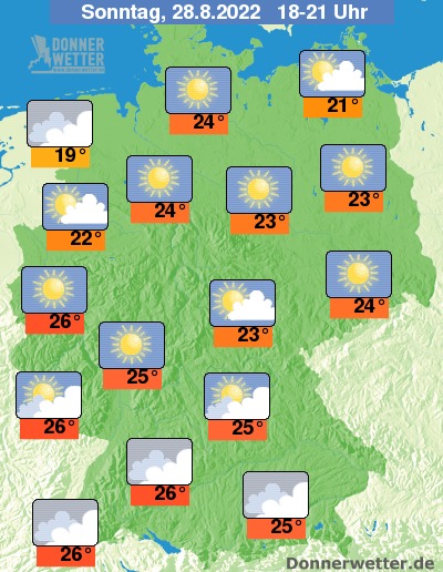 Heute Abend ist es an der Nordsee und im Alpenvorland oft stark bewölkt, jedoch bleibt es dabei weitgehend trocken. Im übrigen Bundesgebiet scheint verbreitet die Sonne und es können nur lockere Wolkenfelder durchziehen. Es bleibt trocken bei 19 Grad in Wilhelmshaven und 26 Grad in Stuttgart.