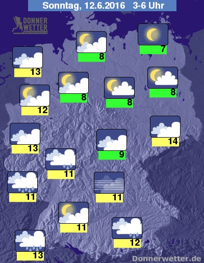In der Nacht zum Sonntag bleibt es über der Nordhälfte Deutschlands meist locker oder aufgelockert bewölkt und trocken. Weiter südlich halten sich hingegen oft dichte Wolken und es bilden sich gebietsweise Schauer, seltener auch einzelne Gewitter. Die Temperatur sinkt auf 13 Grad in Köln und bis 7 Grad in Neubrandenburg.