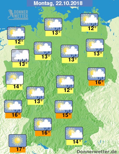 Zum Start in die neue Woche ist es lediglich über dem Süden noch meist heiter bis sonnig. Im übrigen Bundesgebiet ziehen meist aufgelockerte, zum Teil aber auch dichte Wolken durch, die zeitweise für Regen sorgen. Südlich des Mains bleibt es bis in die Abendstunden noch trocken. Die Temperatur erreicht 12 bis 17 Grad.