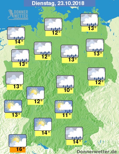 Am Dienstag ist es über dem Südwesten meist aufgelockert bewölkt und trocken. Dagegen bleibt der Himmel über dem übrigen Bundesgebiet weitgehend dicht bewölkt und es fällt auch zeitweise Regen. Die Temperatur steigt auf herbstliche 10 bis 16 Grad. An den Küsten und auf den Bergen der nördlichen Mittelgebirge herrscht teils schwerer bis orkanartiger Sturm.