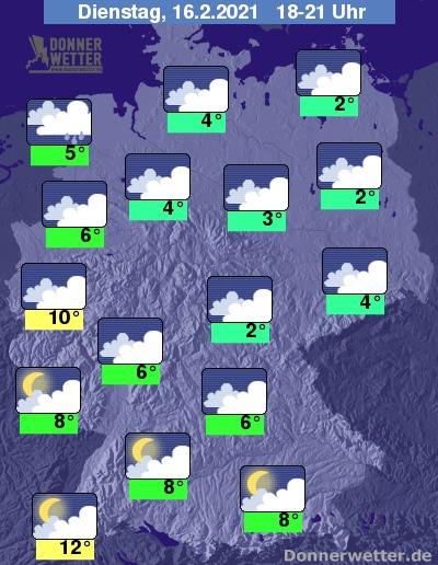 Heute Abend ist es verbreitet bedeckt oder neblig-trüb, im Südwesten und Süden zeigen sich auch hier und da Auflockerungen. Im Küstenumfeld von Nord- und Ostsee ist vereinzelt etwas Regen möglich, im übrigen Bundesgebiet bleibt es aber trocken. Die Temperatur liegt bei 2 Grad in Stralsund und bis zu 12 Grad in Freiburg.