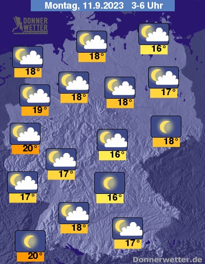 In der Nacht zum Montag ist es im Süden und Osten noch oft sternenklar, sonst zieht allerdings auch oft leichte Bewölkung durch, dazu bleibt es aber trocken. Die Temperatur sinkt auf tropische 20 Grad in Freiburg und bis 16 Grad in Neubrandenburg.