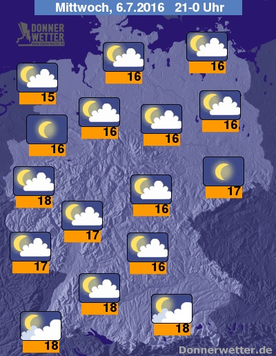Ruhiges und trockenes Hochdruckwetter begleitet uns dann auch während der Partie Portugal - Wales. Meist ist der Himmel locker bewölkt, im Erzgebirge sowie am Niederrhein zeigt sich der Himmel auch klar.