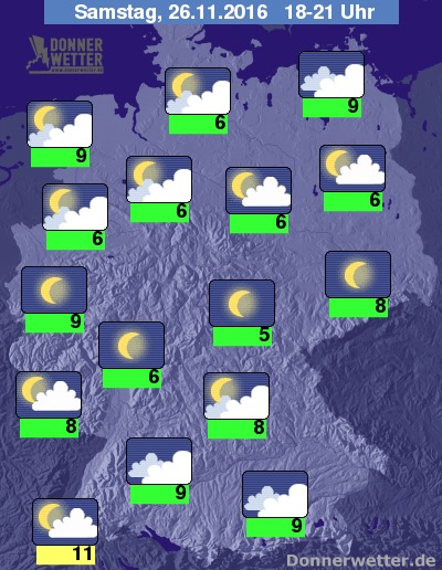 Heute Abend ziehen über den Süden und im weiteren Verlauf auch über die Regionen um Nord- und Ostsee dichte Wolken hinweg, dabei können hier und da auch einge Tropfen fallen. Oft leicht bewölkt oder sternenklar ist es über der breiten Landesmitte, in den übrigen Landesteilen ist es locker bis aufgelockert bewölkt, dazu bleibt es trocken. Die Abendwerte liegen bei 5 bis 11 Grad.