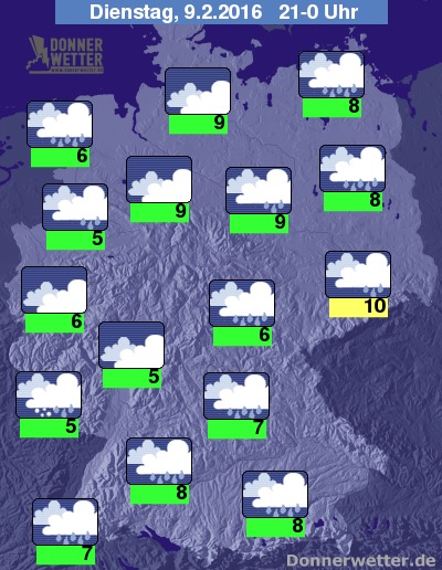 Heute Abend bleibt es bei einer dichten Wolkendecke aus der immer wieder, teils kräftiger Regen fällt. Besonders im Süden Deutschlands fällt der Regen auch gebietsweise ergiebig. Die Schneefallgrenze sinkt bis Mitternacht auf 500 bis 700 m, dabei klingen die Niederschläge im Westen und Osten des Landes meist ab. Die Abendtemperatur liegt bei 10 Grad in Leipzig und etwa 5 Grad am Niederrhein. Es weht frischer bis starker, in Böen auch stürmischer Wind.