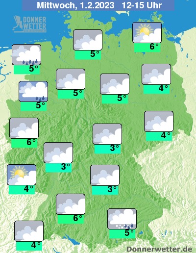 Heute Nachmittag zieht weitgehend dichte Bewölkung durch, dabei fällt hier und da etwas Regen, Schneeregen, im Süden und Osten teils Schnee. Häufig bleibt es auch trocken bei Werten von 3 Grad im Vogtland und 6 Grad im Rheinland. Es weht ein starker und teils stürmischer Wind. An der Nordsee herrscht oft schwerer Sturm.