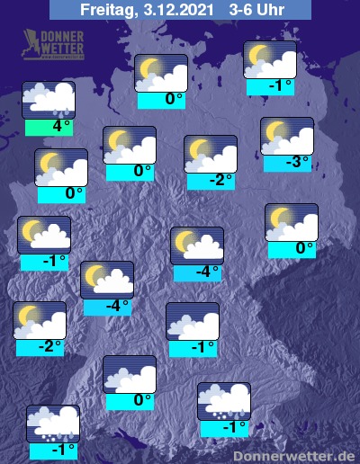 In der Nacht zum Freitag zeigt sich der Himmel häufig locker bis aufgelockert bewölkt. Im Süden und auch im Nordwesten halten sich hingegen meist dichte Wolken, hier bilden sich einzelne Schnee- oder Regenschauer. Im übrigen Land bleibt es weitgehend trocken bei Tiefstwerten von 4 Grad an der Nordsee und bis -4 Grad am Westerwald.