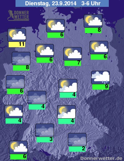 In der kommenden Nacht klingt auch der Regen im Osten und Südosten immer weiter ab und gegen Morgen kann es hier etwas auflockern, sonst ist es bereits vielfach aufgelockert bewölkt, gebietsweise auch klar und trocken. Es bildet sich jedoch stellenweise Nebel oder Hochnebel. Die Temperatur sinkt auf 11 Grad an der Nordsee und auf sehr frische 2 Grad am Alpenrand.