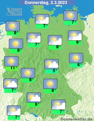Am Donnerstag ist es überwiegend heiter oder sonnig. Südlich des Mains ist es zum Teil auch neblig-trüb. Es bleibt trocken bei Temperaturen von 5 Grad im Eichsfeld und bis 11 Grad in der Kölner Bucht.