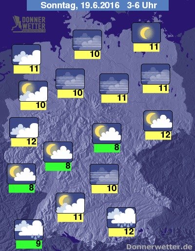 In der folgenden Nacht sind über dem Großteil des Landes anfangs hier und da noch vereinzelte Schauer, selten auch Gewitter möglich. Im Nachtverlauf klingen die Niederschläge und seltenen Gewitter jedoch weitgehend ab und der Himmel ist dann oft nur locker bewölkt, zum Teil auch sternenklar. Am Alpenrand bleibt es dagegen bei meist dichter Bewölkung, dazu fällt hier zum Teil kräftiger und langanhaltender Regen. Die Temperatur sinkt auf 12 Grad in Köln und bis etwa 8 Grad am Pfälzer Wald.