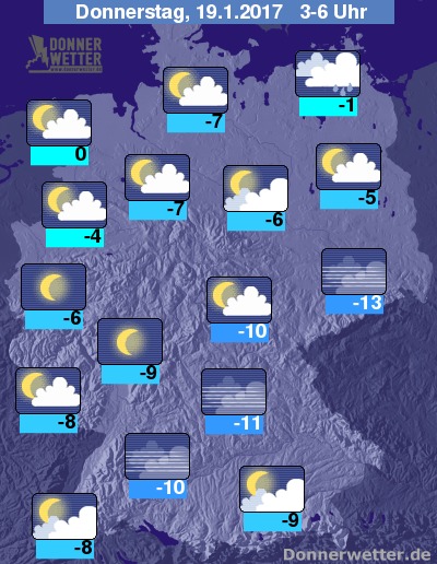 In der Nacht erwartet uns wieder Frost und eisige Kälte: Bis zu minus 13 Grad erwarten wir im Osten beim Erzgebirge. Auch im Südosten sinken die Temperaturen weitestgehend auf unter minus 10 Grad C. Die Höchsttemperatur liegt diese Nacht um 0 Grad C im Emsland.