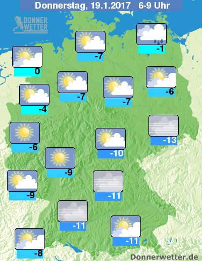 Am Donnerstagmorgen bleibt es zunächst kalt: Zwischen minus 10 und minus 13 Grad erwarten wir im Südosten des Landes. An der Nordsee liegt die Temperatur um 0 Grad C. Dazu wird es im Norden und Westen überwiegend sonnig mit teils blauen Himmel. Im Südosten teilweise Nebel.