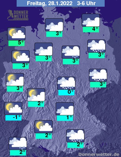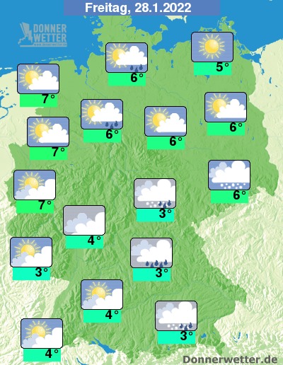 Am Freitag ist es überwiegend stark bewölkt oder bedeckt, vor allem im Norden lockert die Bewölkung aber auch gebietsweise auf, hier bleibt es dazu weitgehend trocken. Im übrigen Land bilden sich bei mehrheitlich dichten Wolken einzelne Regen- oder Schneeschauer. Die Temperatur erreicht 3 Grad in Mittelfranken und etwa 7 Grad an der Ems. An der See weht weiterhin ein zum Teil stürmischer Wind.