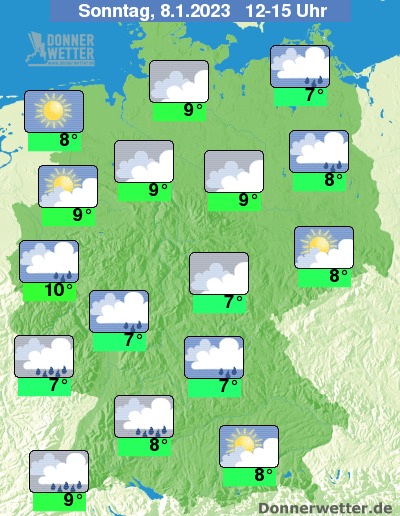 Heute Nachmittag ziehen überwiegend dichte Wolken durch, im Nordwesten und Südosten kann sich die Sonne teils länger zeigen, sonst sind Auflockerungen eher selten. Es fällt gebietsweise Regen bei 7 Grad in Erfurt und etwa 10 Grad in Bonn.