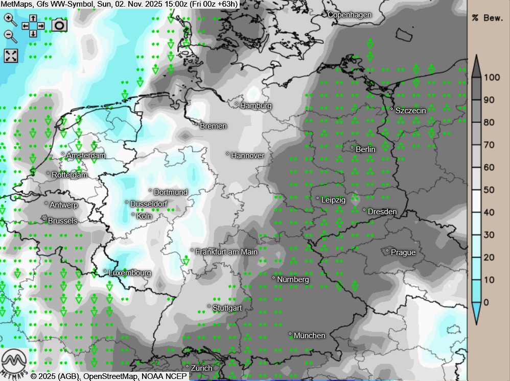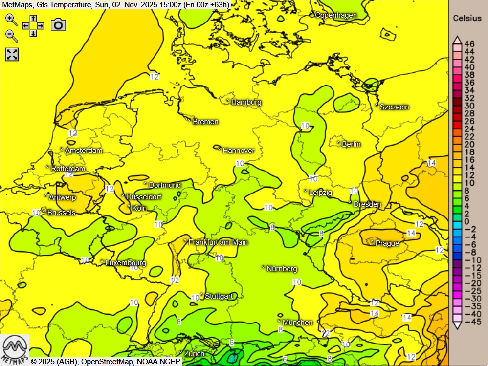 Die Temperatur- und Wetterkarte für Sonntagnachmittag (15:00 Uhr) nach GFS: