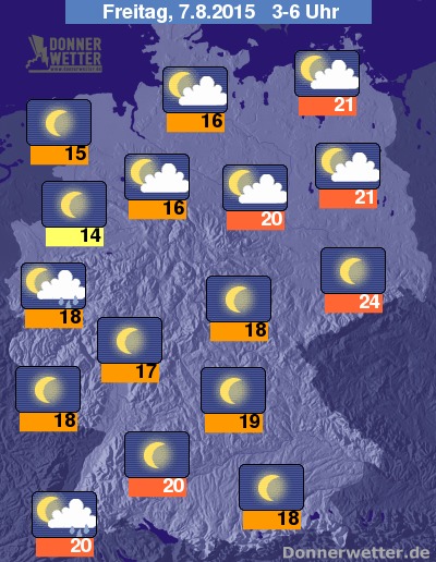 In der kommenden Nacht ziehen im Westen und im Südwesten gebietsweise dichte Quellwolken auf, die für einzelne Schauer und regional auch kräftige Gewitter sorgen können, zumeist bleibt es jedoch trocken und auch leicht bis aufgelockert bewölkt. Im Norden ist es ebenfalls meist leicht oder aufgelockert bewölkt und dazu trocken. In den übrigen Landesteilen ist es sogar weitgehend sternenklar und ebenso trocken. Die Temperatur sinkt auf 24 Grad in Dresden und bis 14 Grad am Niederrhein.