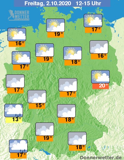 Die Temperaturen bewegen sich zwischen verhaltenen 13 Grad im Saarland und angenehmen 20 Grad in Teilen von Sachsen.