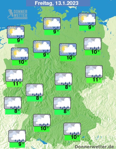 Am Freitag ist es häufig stark bis dicht, im Westen und Norden auch oft nur locker bewölkt. Es bilden sich gebietsweise Schauer, im Süden fällt zeitweise, zum Teil auch langanhaltend Regen. Die Temperatur steigt auf milde 8 Grad in Saarbrücken und bis 11 Grad in Dresden. An den Nordsee weht ein oft stürmischer Wind.
