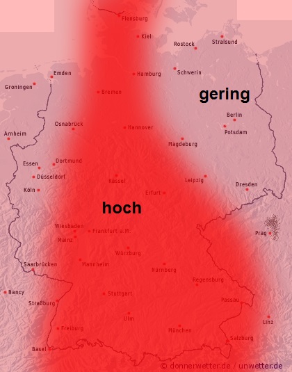 Heute scheint zwischen der Ostseeküste und Berlin-Brandenburg häufig die Sonne und es bleibt hier weitgehend trocken. Im übrigen Bundesgebiet zeigen sich zum Teil Auflockerungen, jedoch ziehen oft auch dichte Wolken durch, dabei sind verbreitet Schauer und teils kräftige Gewitter möglich. Die Temperatur steigt auf 24 Grad an der Nordsee und bis 29 Grad in Magdeburg.