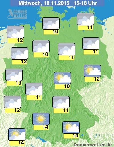 Heute Nachmittag ist es über der Südhälfte des Landes teils stark, teils aber auch aufgelockert bewölkt und es bleibt überwiegend trocken. Vor allem im Süden ist es auch zum Teil heiter. In den anderen Landesteilen hält sich hingegen meist dichte Bewölkung, dazu bleibt es aber ebenfalls weitgehend trocken. Gegen Abend zieht von der Nordsee her jedoch neuer Regen auf. Die Temperatur liegt bei 10 Grad an der Elbe und etwa 14 Grad am Bodensee. Es weht teils frischer bis starker Wind. In Nordseenähe nimmt der Wind zum Abend deutlich zu und an der Nordsee sind dann orkanartige Böen möglich.