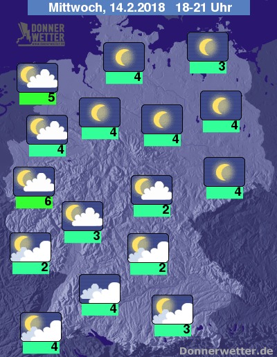 Heute Abend sind in den westlichen Landesteilen sowie im Süden einige, meist jedoch aufgelockerte Wolken unterwegs, dabei bleibt es trocken. Weiter nach Norden und Osten ist der Himmel größtenteils sternenklar, dazu bleibt es ebenso trocken. Die Temperatur liegt bei 2 bis 6 Grad.