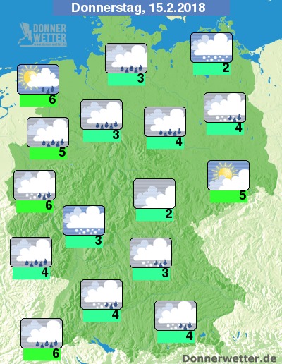 Am Donnerstag ziehen von Westen dichte Wolken durch, dabei fällt wiederholt Regen, Schneeregen und Schnee. Gegen späten Nachmittag lockert es im Nordwesten und Westen häufig auf, dazu bleibt es dann meist trocken. Die Temperatur steigt auf 2 Grad im Vogtland und bis 6 Grad am Niederrhein.