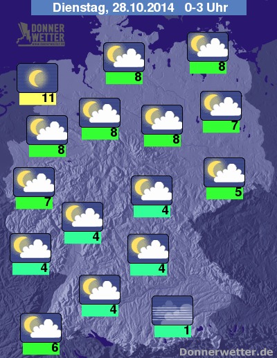Die erste Nachthälfte zeigt sich überwiegend locker bewölkt; vor allem im äußersten Nordwesten kann es stellenweise auch aufklaren, entlang des Alpenrands ist örtliche Nebelbildung möglich.