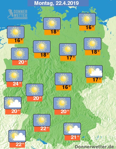 Am Montag präsentiert sich das Land überwiegend sonnig, Richtung Alpenrand, Erzgebirge und nach Südwesten hin sind hier und da aufgelockerte Wolken möglich, es bleibt aber bundesweit trocken. Die Temperatur steigt auf 16 Grad an der See und bis 24 Grad in Bonn.