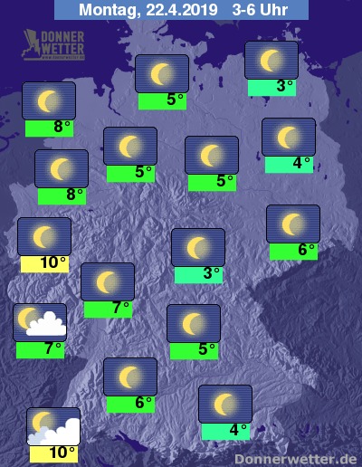 In der Nacht zum Montag können entlang des Ober- und Mittelrheins einige Wolken durchziehen, sonst ist es jedoch verbreitet sternenklar. Es bleibt überall trocken bei Tiefstwerten von 10 Grad in der Kölner Bucht und bis 3 Grad im Vogtland.